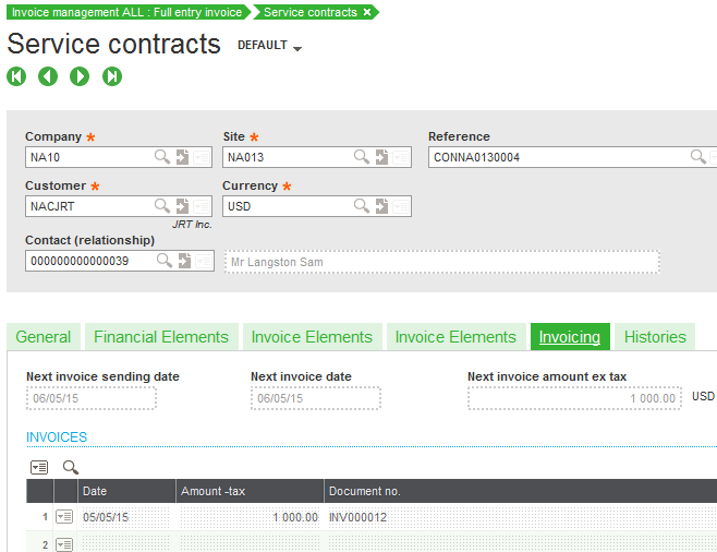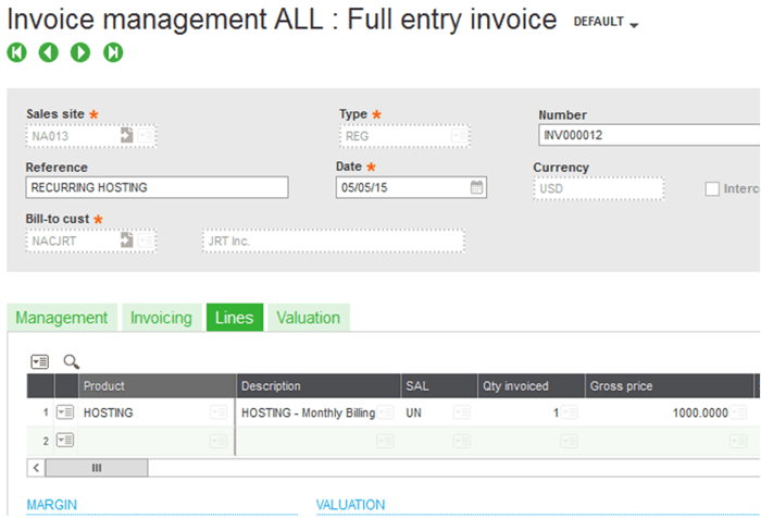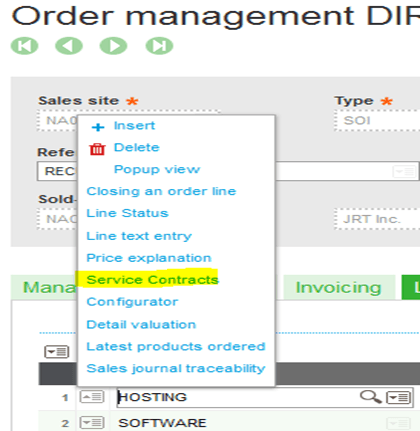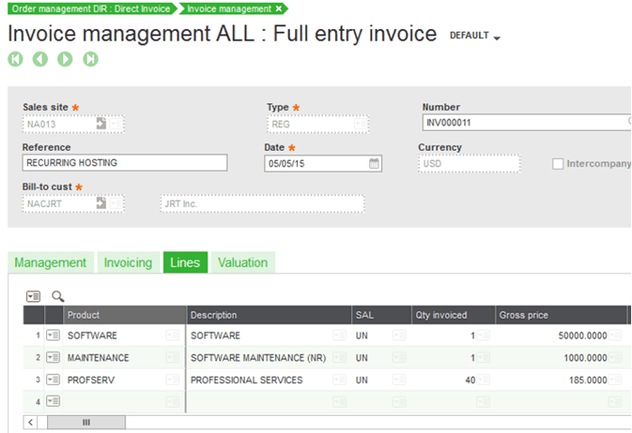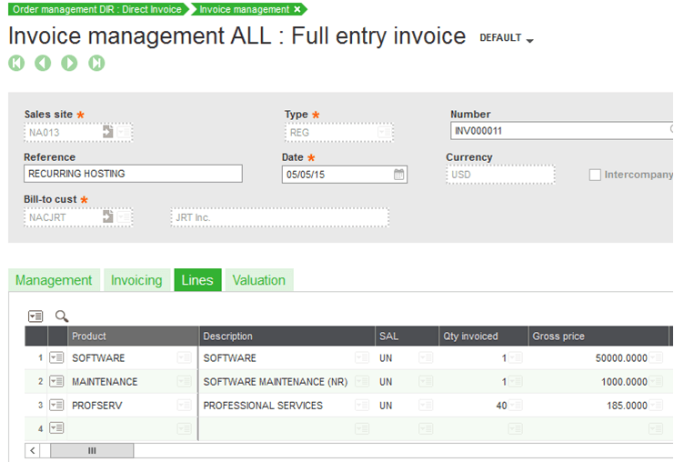 Example of a Sage X3 sales order with both direct and recurring invoice lines: