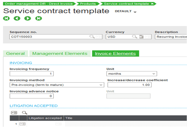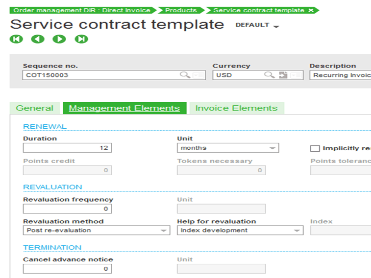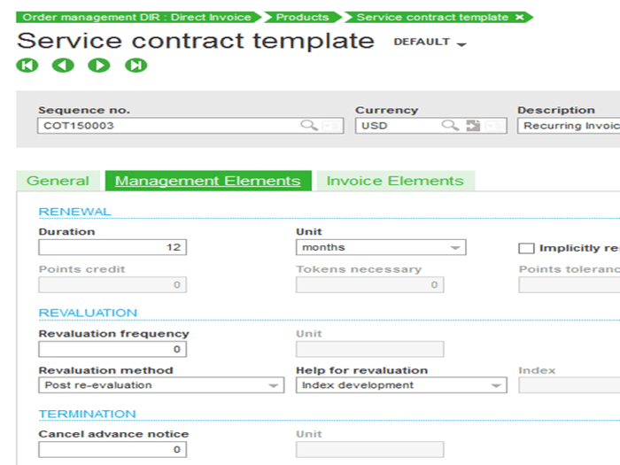The management and invoice element tabs define the term and frequency of the recurring billing.