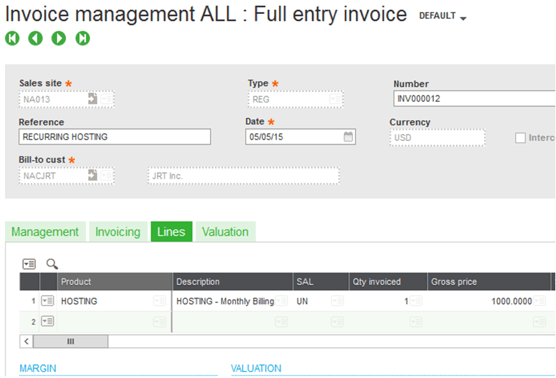 Have you ever wanted to combine a “direct Invoice” and a “recurring billing” in the same sales order? Perhaps there are some lines that must be invoiced for services and others for monthly recurring payments? Interesting thing is you can create this scenario in Sage ERP X3. Here's how.