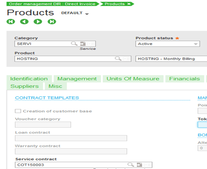 The HOSTING (example product) is setup with a Service Contract associated with the product master file. Create a SC Template that is a “maintenance” category as follows: