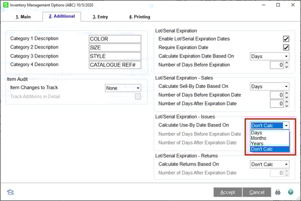 Now you can track expiration dates within Sage 100 with Product Update 1. New Lot and Serial options have been added under the Additional tab in Inventory Management Options. These new options give your company the ability to track serial items by Lot and Serial Expiration dates. Use the options setup, to configure if those dates need to change when Sold, or if Issues and Returns transaction are used.