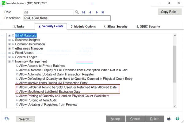 Open Library Master -> Main -> Role Maintenance. Under Security Events -> Inventory Management there are two new Security Events.