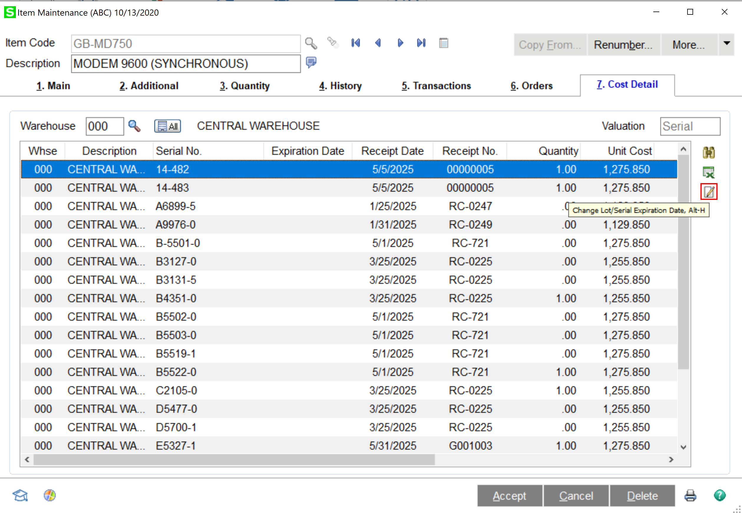 If they have “Allow Modifying of Lot/Serial Expiration Date” an additional icon will appear in Inventory Management -> Costs Detail Tab allowing the entry of a New Expiration Date.