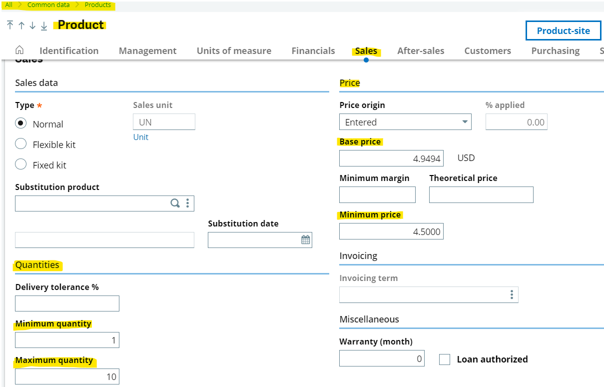 First, X3 offers the option of adding a base price and / or order quantity requirements to a product in the system. In order to do this, navigate to the product screen in Sage X3, Common Data > Products > Products. In the Sales tab/section under Price, a user can add a base price or a minimum price to the product. The base price will default for that product in the Sales Order. The minimum price will add a check to confirm whether the price of that product in the Sales Order meets that field or is higher. Within the same tab, scroll to the Quantities section. Here, the user can set minimum and maximum quantities for a specific product if desired.
