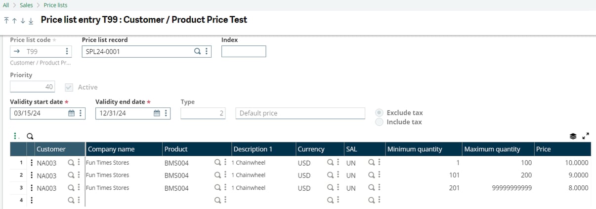 In the example below, the custom price list sets default prices based on a Sales Order based on three different quantity ranges when that specific customer (NA003) and product (BMS004) is used.