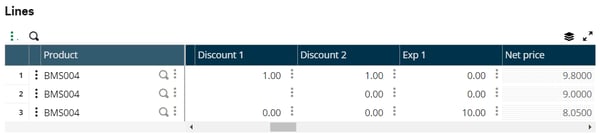 - Line 1: adds calculation basis per unit Discount 1 and Discount 2 with 1.00 each, respectively. This updates the Net Price from $10.00 to $9.80 because each discount reduces each unit price by 1%, totaling a 2% discount.