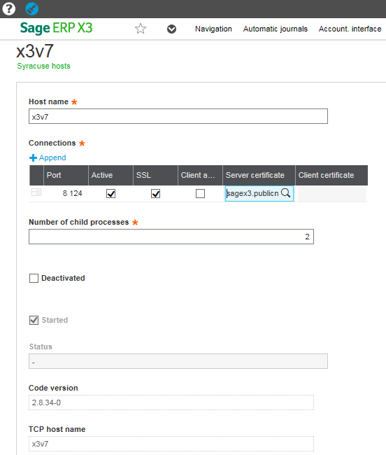 6. Once the certificate is created in Sage X3, go to the Hosts function in the Administration module and edit the existing host record
