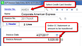 - Enter the Vendor that has been setup as a credit card vendor (AMEX, VISA, MC)
