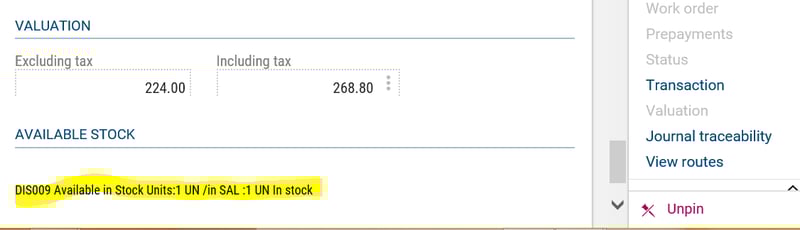 When you enter a Sales Order Line where the product has all the stock available you get a message like the one highlighted below, letting you know that there is stock available for this Sales Order line.