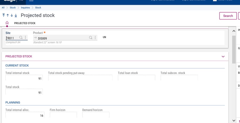 Clicking on Projected Stock takes you to the Projected Stock Inquiry Screen.