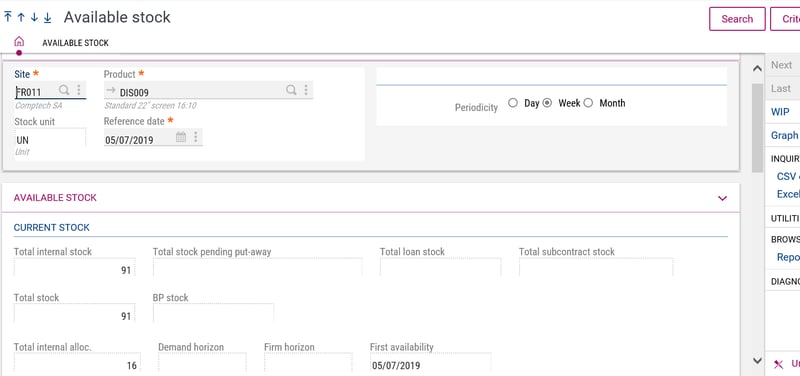 Clicking on Available stock takes you to the Available stock Inquiry: