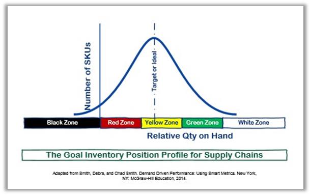 The middle range—the YELLOW ZONE—represents where the real value is found in holding inventory. It is the right amount of stock for each SKU based on each SKU's rate of consumption, lead-time, and other factors such as demand and supply variability.