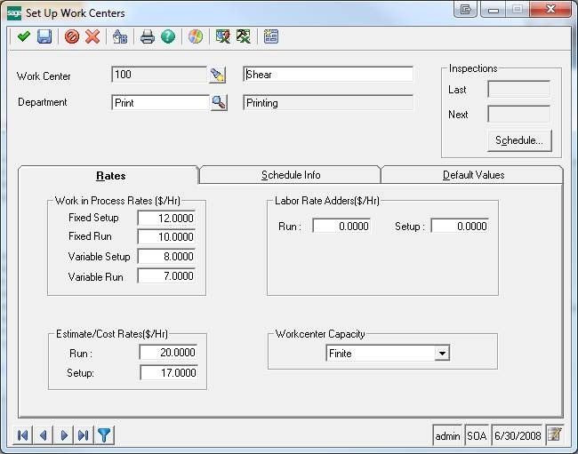 In the Sage 500 ERP Set Up Work Center screen there are places for “Fixed Setup” costs and “Fixed Run” costs. The values placed here are used to absorb “Fixed” overhead costs at the rate supplied based on each hour of “Setup” or “Run” time calculated for production utilization of the Work Center.