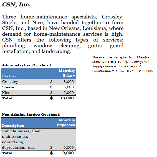In order to make the allocations easy to follow, you will see that the company is a service company and that the firm has three partners (administrative overhead) and some relatively fixed overhead in the form of vehicle leases, maintenance and so forth.
