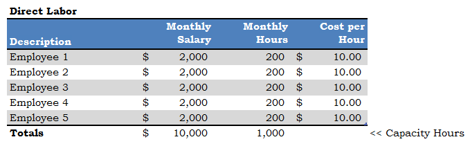 The direct labor (production labor) comes from five employees who—to make it simple—all work exactly 200 hours per month and all make exactly the same rate—$10 per hour. This also gives “production” a known capacity—1,000 hours per month.