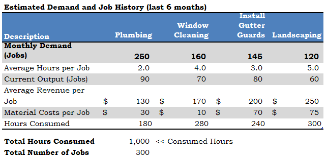 From this analysis, they discover that their most profitable jobs are landscaping jobs ($35 per job), followed closely by window cleaning jobs ($30 per job). So, they decide to satisfy the market demand in that order, using the resources they have (1,000 hours of production time).