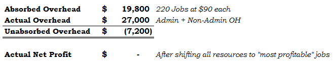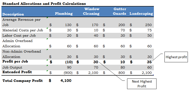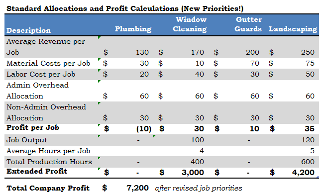 Again, the problem is that since NO plumbing or gutter guard jobs were done, some of the overhead (allocated at $90 per job) was not absorbed in the calculations. The total overhead is $18,000 plus $9,000, or $27,000. But the 220 jobs only absorbed 220 times $90, or $19,800 in overhead. That leaves $7,200 in overhead NOT absorbed. Take that $7,200 away from the calculated profit of $7,200 and the company is actually worse off (zero profit) after having reallocated its resources to what appeared to be the “most profitable jobs.”
