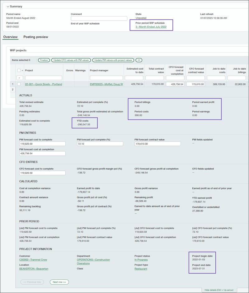Enhancements in Work In Progress (WIP) Management: The following fields have been created in the WIP schedules: Prior period WIP schedule, YTD costs, Period billings, Period costs, Period earned profit, Period earnings, Project begin and end date.