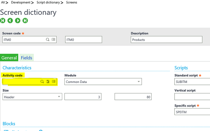Once the folder is revalidated, the object dictionary (tables, screens, etc.) gets copied from the reference folder, overwriting existing objects. Only object or object elements (field, indexes, etc.) flagged with a specific activity code are protected. Header level is the General Tab.
