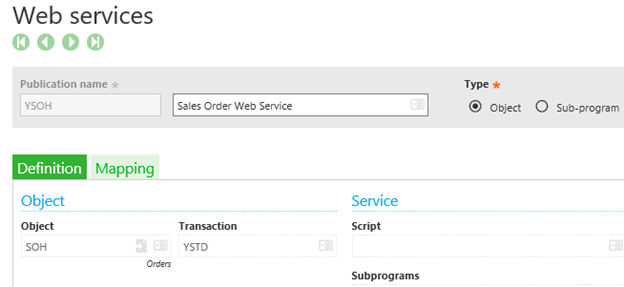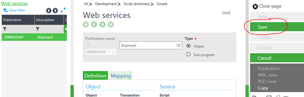 If any changes are made to the Entry Transaction, Screen, Object or Windows associated with an object published as a web service, each of the changed entities (entry transaction, screen, object, window) must be re-validated, and the web service must be republished. When a change is made, the "Save" button will be enabled when the web service is pulled up, as shown below, and the web service will likely not be functional.