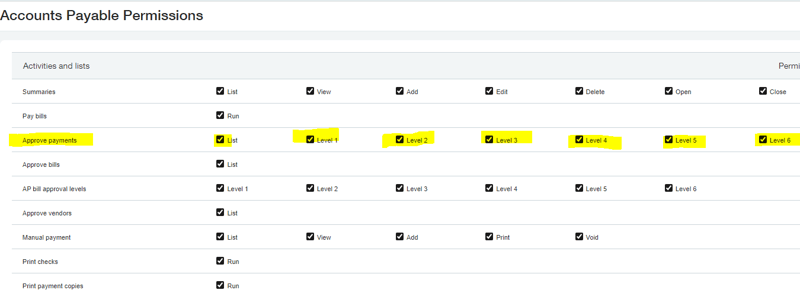 In a role-based environment, approval levels are assigned to roles (these levels can be found by editing the permissions for accounts payable under the applicable role). If roles are not turned on, these permissions can be found in the user’s subscriptions.