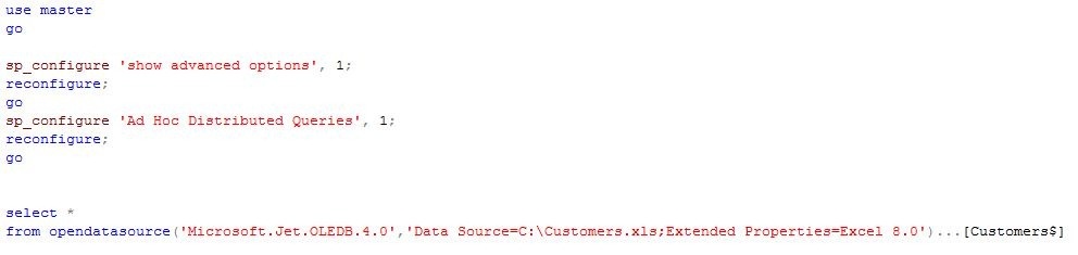 Note also the ‘Data Source=’ portion of the OPENDATASOURCE parameters. This is where you inform SQL Server the location of the Excel file to be opened. The ‘[Customers$]’ at the end of the statement represents an named range in the Excel workbook.