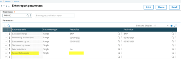 The Banking Reconciliation reports have been enhanced with new parameters that allow you to select the reconciliation date when launching the report. This saves time by allowing you to easily re-print the report for a past date.