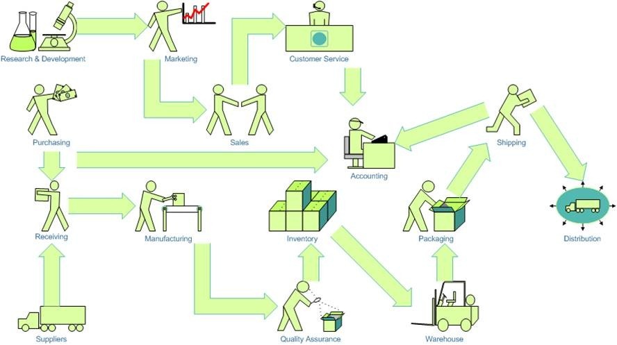 Here are two illustrations covering the “functional” (i.e., department or silo) view versus the process “flow” view of an enterprise: