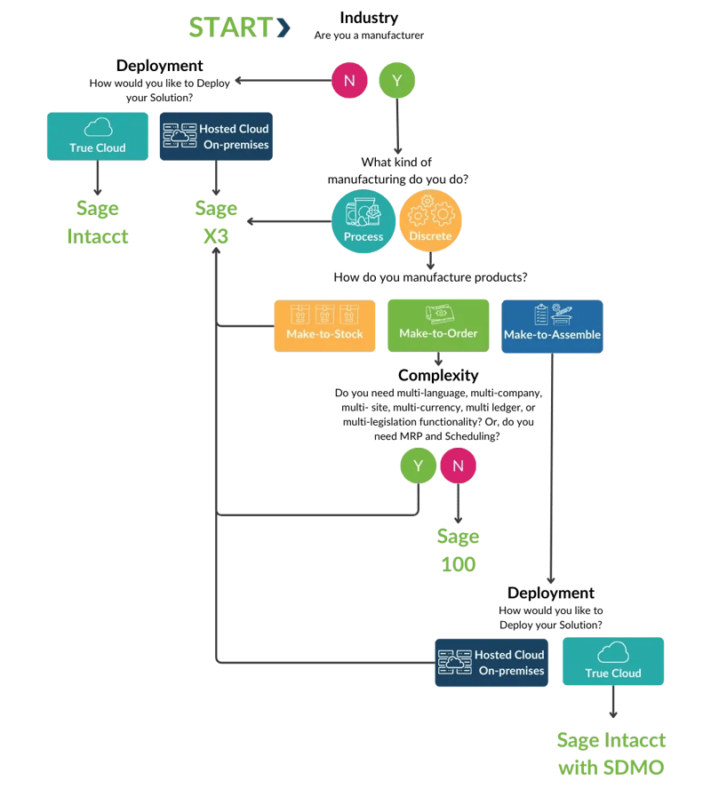 If you're just starting to explore financial management software solutions, the Sage product portfolio may seem a little overwhelming. Sage Intacct vs. Sage X3...Sage X3 vs. Sage 500 (hint–not this one)...Sage Intacct vs. Sage 100...Sage 100 vs. Sage X3...Sage Intacct vs. Sage 300? Use this simple flow chart to help figure out which Sage product is the most likely fit for your business.
