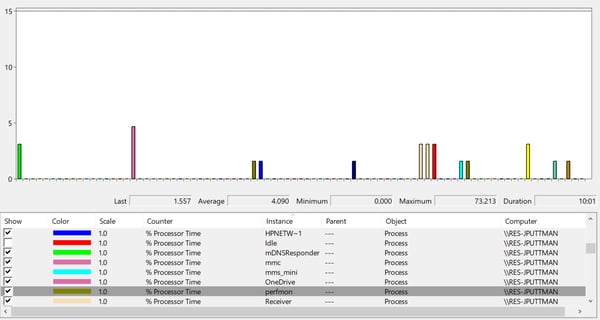 This view is useful when displaying multiple instances of the same counter in order to see their relative differences. This performance monitor is setup to show the various name processes that are running on the machine and the percent of processor time that each one is using. The histogram is able to show you how much impact each process is making relative to the others.