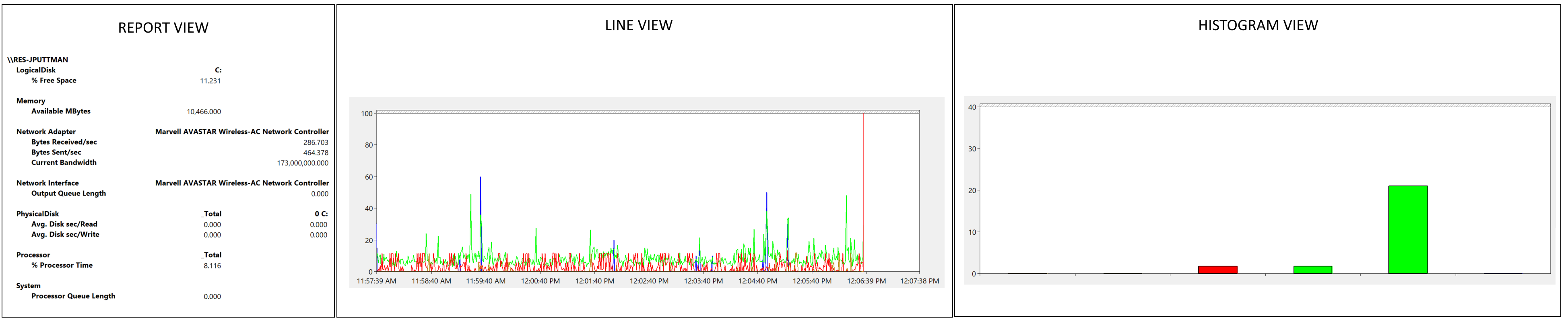 The line view is the typical view that you use with performance monitor. This displays a line on the graph for each counter that you are monitoring. Each counter is auto-scaled when you add it to the monitor, and a color is selected. The line view is used to show trends that are occurring over time. It can also be used to visually correlate the changes in several counter values to each other. One challenge with the line view is that if you have many counters in the monitor it can be hard to distinguish between the lines.