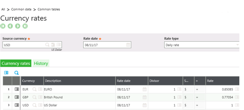 The currency rates are stored in X3 for each date the rates are imported. Since the import can be done daily, weekly, monthly, or on demand, the number of dates stored varies. The rates can be viewed within X3 by date and currency, as shown below.