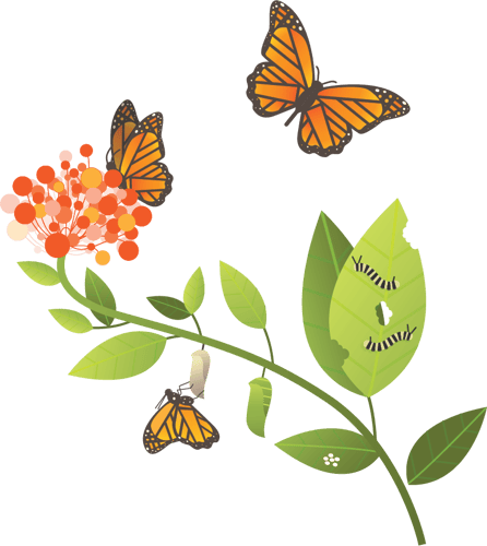 Monarchs cannot survive without milkweed; their caterpillars only eat milkweed plants (Asclepias spp.), and monarch butterflies need milkweed to lay their eggs. With shifting land management practices, we have lost much milkweed from the landscape. Planting native milkweeds provide food for monarch caterpillars and native flowers provide food for adult butterflies.