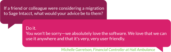 Pull-Quote-Do-itFollowing their company’s culture of technological progress, in March 2020, Hall Ambulance’s accounting team went live with a new Sage Intacct cloud financial management solution. Before they decided to make the switch to Intacct, Hall Ambulance was using Sage 300 and struggling with clunky reporting and dated technology in the old system. Recently RKL eSolution’s Director of Cloud Sales, Mark Severance, sat down with Michelle Garretson, Financial Controller at Hall Ambulance, to discuss her experience in migrating to Sage Intacct.